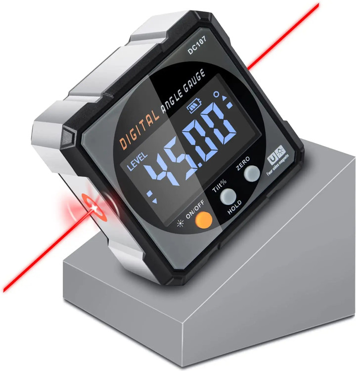 زاویه سنج دیجیتال یک دستگاه ضدآب کوچک است که خوانش دیجیتال بین ± 90 درجه با دقت 0.05 درجه را ارائه می دهد و دارای قابلیت خاموش شدن خودکار پس از 5 دقیقه است. به اندازه کافی کوچک است که بتوان آن را در جیب خود حمل کرد و صفحه نمایش LED به راحتی قابل خواندن است. آهنرباهایی را در پایه برای چسبندگی به هر سطح آهنی برای اندازه گیری دقیق زوایای اره دورکن و فارسی بر. زاویه تیغه اره را با دقت تنظیم می کند. نور پس زمینه LCD خودکار صفحه نمایش بزرگ برای خواندن آسان دیجیتال اندازه گیری در حالت مطلق یا نسبی زوایای نمایش داده شده بر حسب درجه