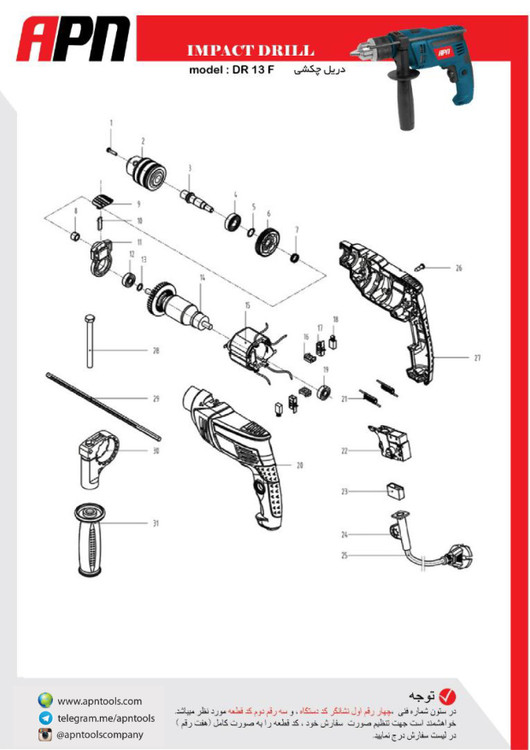 آچار سه نظام، خط کش، دسته کمکی 360، جفت زغال، دفترچه راهنما