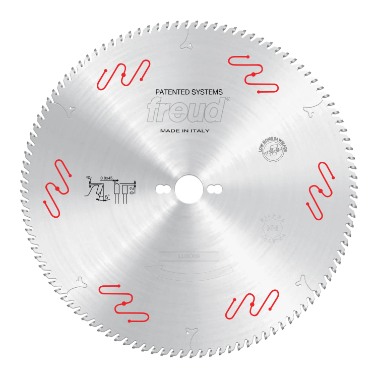 سنگزنی و تنشدهی دقیق با تلرانس بالا شامل بدنه تیغ برش لیزری از فولاد Rockwell 48 (بالاترین کیفیت فولاد در جهان) که در طول عمر تیغ صاف و پایدار باقی میماند و دقت نهایی را در برش و سایز کزدن صفحات ملامینه و سهلایه تضمین میکند.